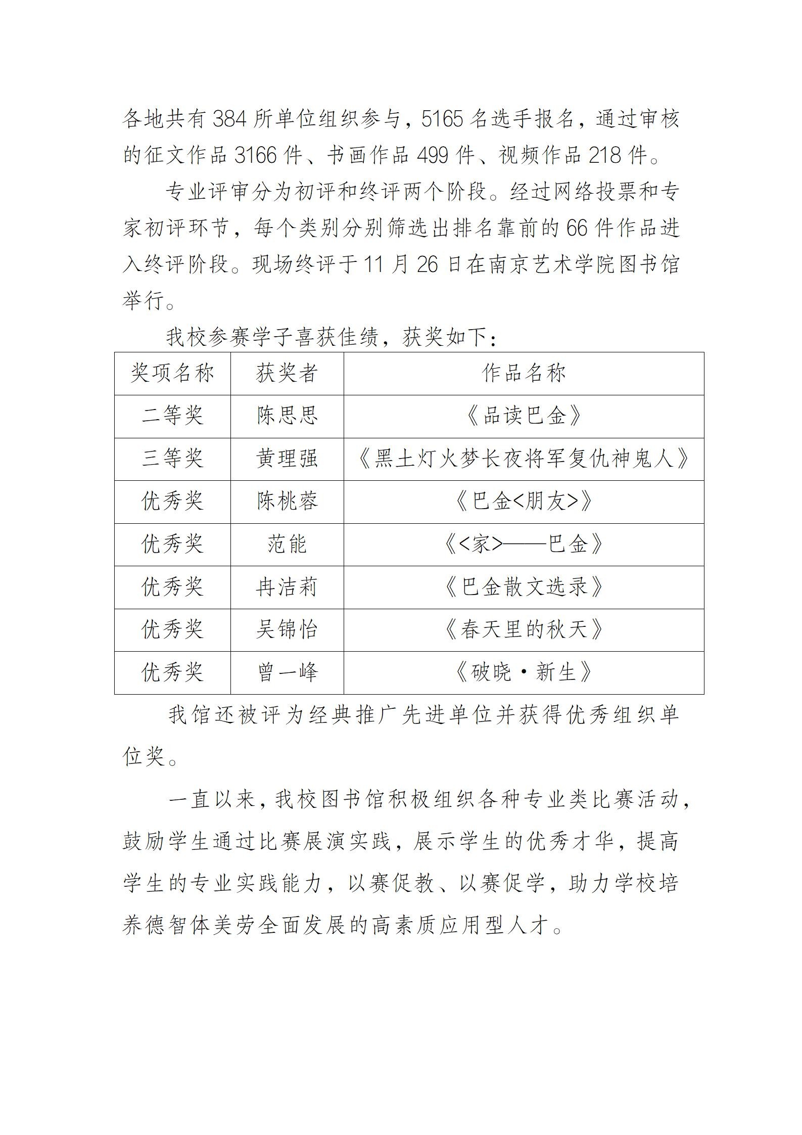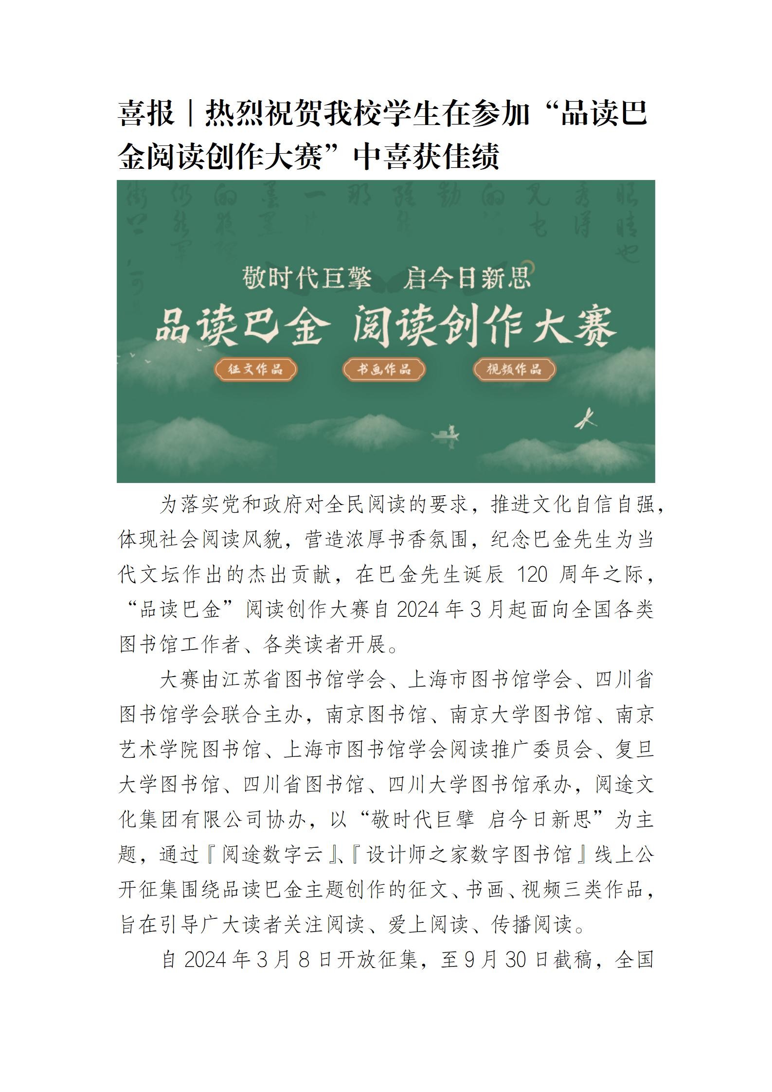 喜报|热烈祝贺我校学生在参加“品读巴金阅读创作大赛”中喜获佳绩
