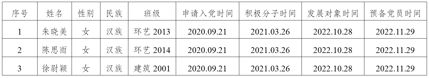 在征求党小组和党员、群众意见的基础上,经支部委员会审查,拟将朱晓美等3位同志转为中共正式党员。根据发展党员工作有关要求,现将其有关情况公示如下,同志在预备期间表现良好。经党支部培养教育和考察,拟将朱晓美等3位同志转为中共正式党员,并于近期召开支部大会讨论其转正问题。