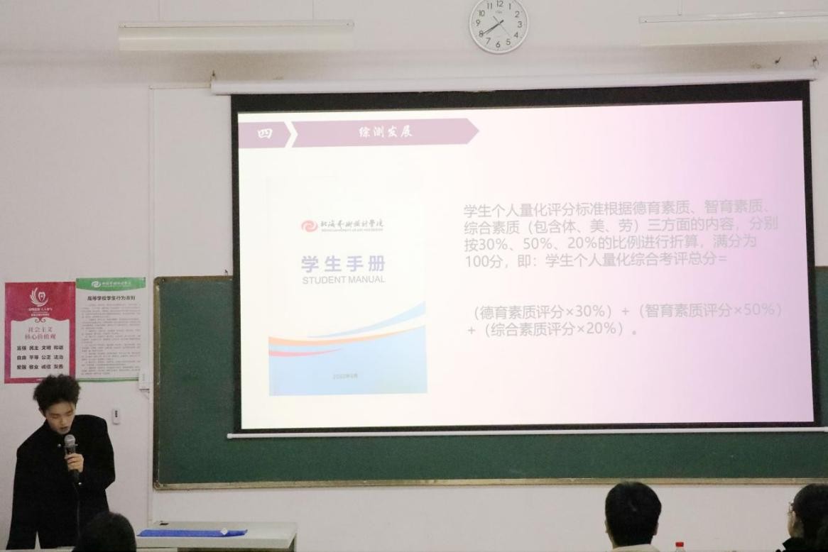 活动在主持人陈雨悦同学的开场中拉开帷幕,她向师生介绍了出席的领导与老师,点明活动以朋辈分享为核心的初衷。分享环节,环境设计专业2303班滕涣然学长结合专业课学习、学科竞赛经历,讲解了专业学习方法与实践平衡技巧;2308班朱乐宜学姐则围绕校园生活、职业规划展开分享,针对社团选择、实习准备等给出实操建议,两位主讲人的分享真诚接地气,引发新生强烈共鸣。