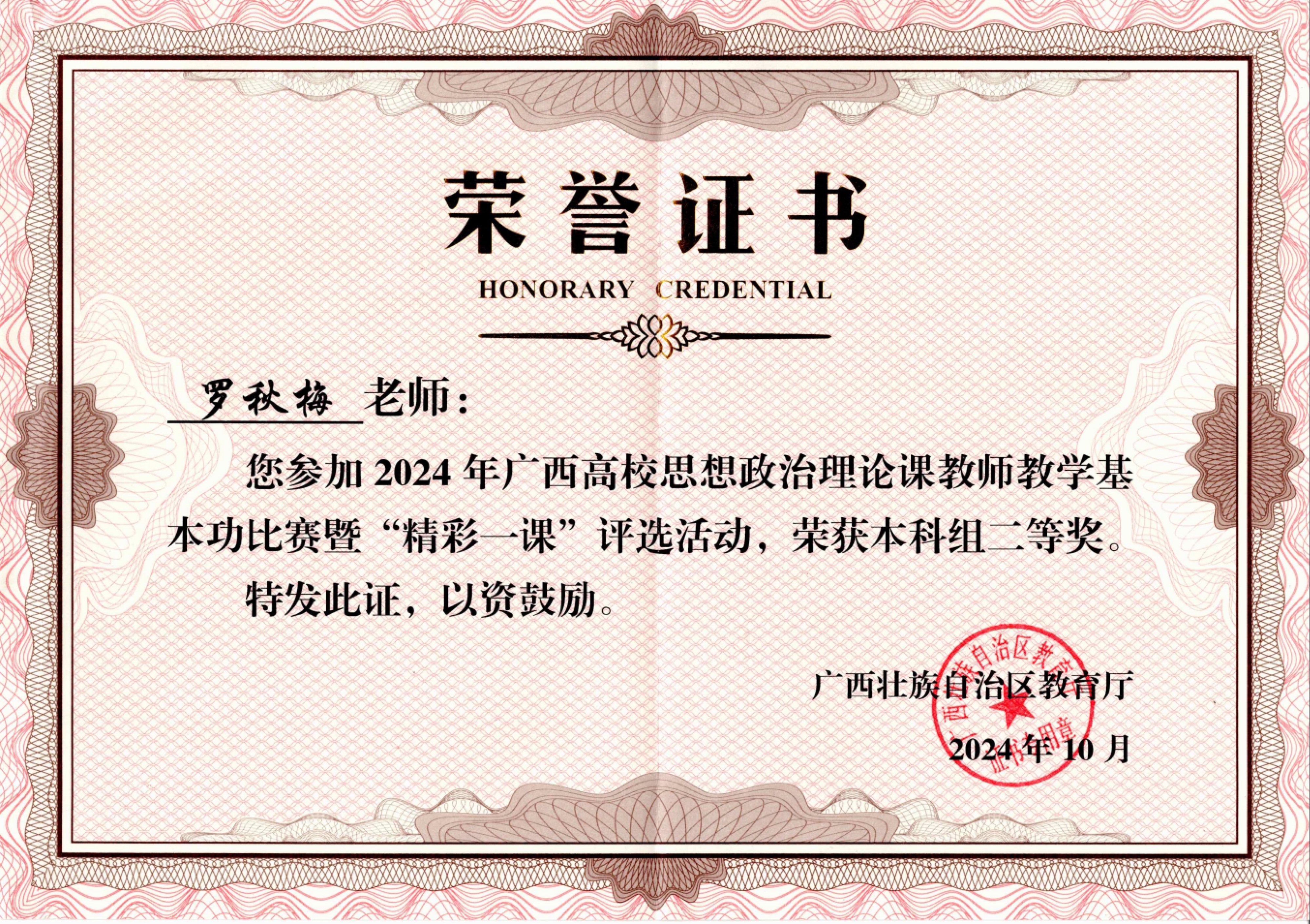喜报:我院教师罗秋梅荣获2024年广西高校思想政治理论课教师教学基本功比赛暨“精彩一课”评选活动本科组二等奖