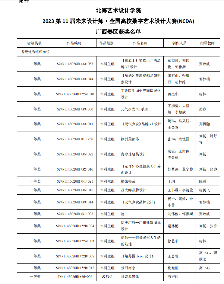 我院师生在2023第11届未来设计师·全国高校数字艺术设计大赛(NCDA)广西赛区取得优异成绩!共荣获广西区赛一等奖17项、二等奖20项、三等奖28项,学校荣获“省级优秀组织单位”奖。