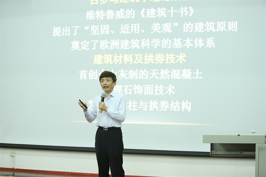 讲座伊始,李沙教授从古罗马建筑艺术的建筑理论、建筑技术、建筑材料三个方面同在场师生展开深刻探讨,并从维特鲁威的《建筑十书》一书中凝练提出了“坚固、适用、美观”的建筑原则,进一步延伸讲授到建筑的安全性、功能性、艺术性,展现了欧洲建筑科学的基本体系。