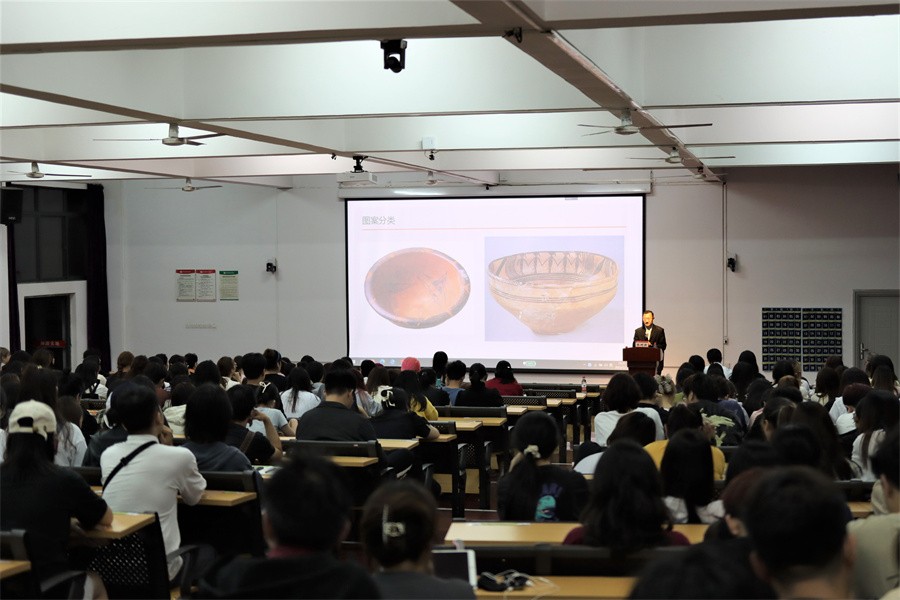 张树新教授从图案的审美要素入手,阐述了图案的“节奏美”“韵律美”“秩序与变化美”“层次与空间美”,并从图案造型的生动性”“情节的故事性”“内容的思想性”等方面,对“图案的视觉语言”进行了深入浅出的讲述。张树新教授通过展示一系列彩陶、青铜和瓷器图片,用生动有趣的语言讲解了中国传统图案分类。张树新教授表示,正是因为不同的材料和工艺,使得图案展现出不同的美,让在场师生意识到在研究图案的同时,也是一个认识图案由来、在图案中吸取灵感,并且运用到自己设计中的一个过程。
