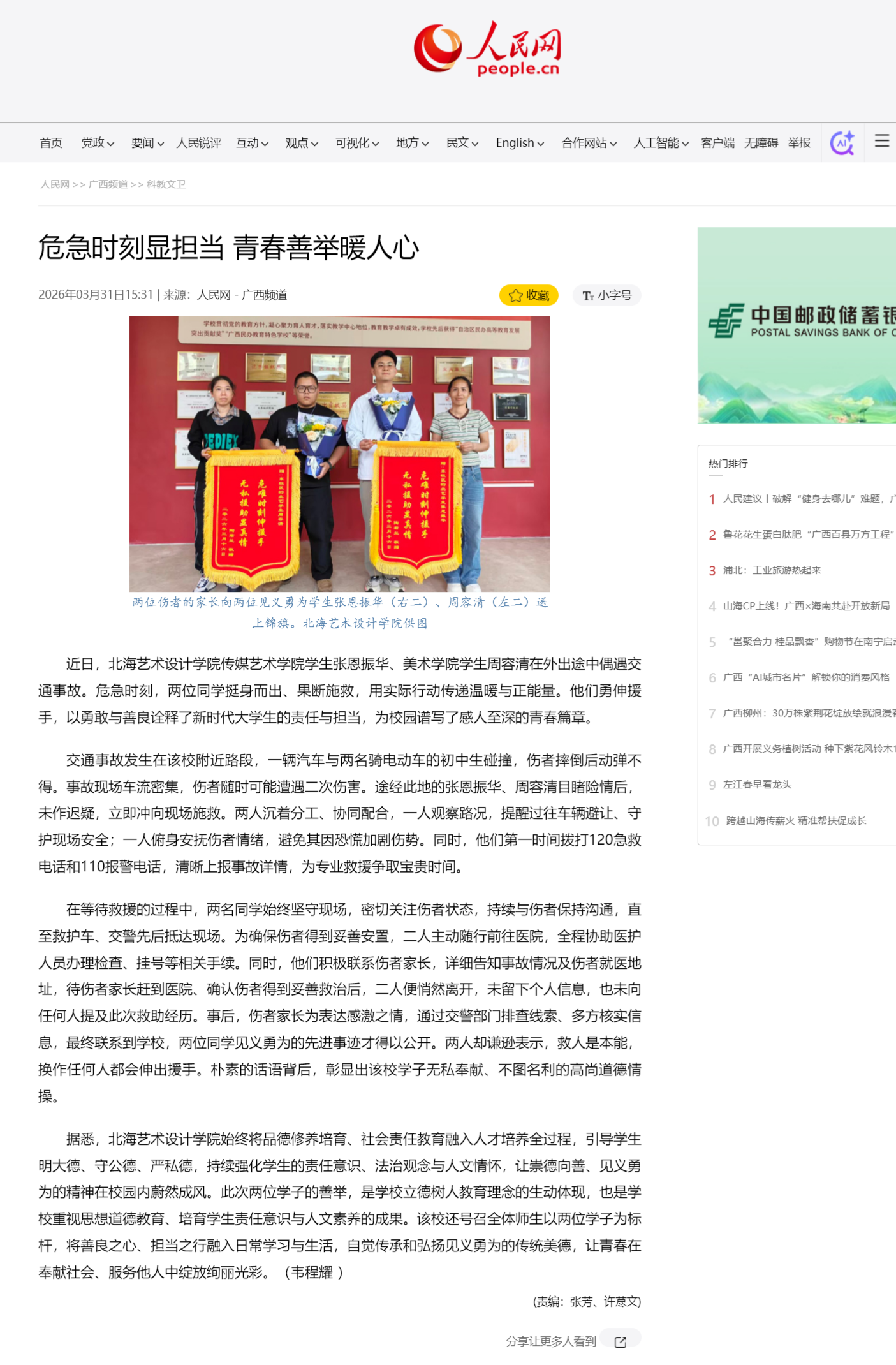 人民网:危急时刻显担当 青春善举暖人心