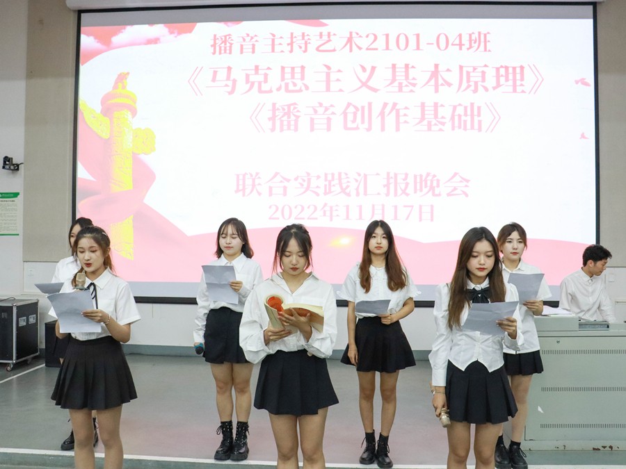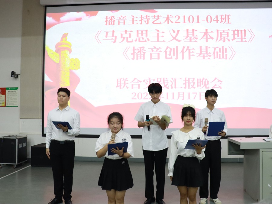 11月17日晚,依托马克思主义学院和动画与传媒学院共建的思政课实践教学研习基地——红色播音创作室,以朗诵演出的形式,在公德楼107联合举行了《马克思主义基本原理》与《播音创作基础》课程实践教学成果展示汇报会。马克思主义学院院长姜献生教授、动画与传媒学院副院长杨红夷副教授莅临指导。播音与主持艺术专业2021级全体学生参加,两门课程的教研室主任及任课老师也亲临现场。