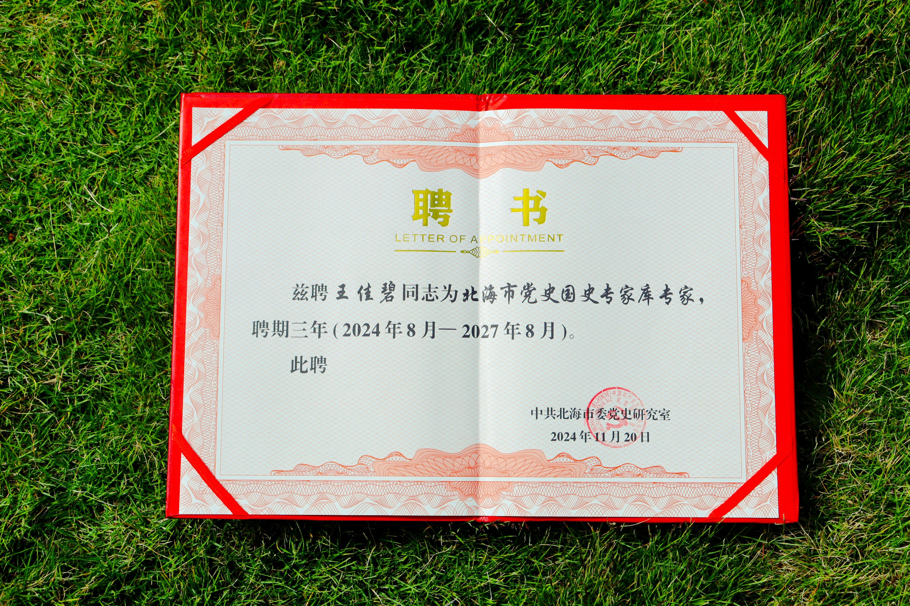 最终,经过严格筛选和研究审定,我院院长姜献生、综合办主任王佳碧凭借其在该专业领域的突出优势,成功入选,被光荣聘为北海市党史国史专家库专家,聘期三年,时间从2024年8月—2027年8月。