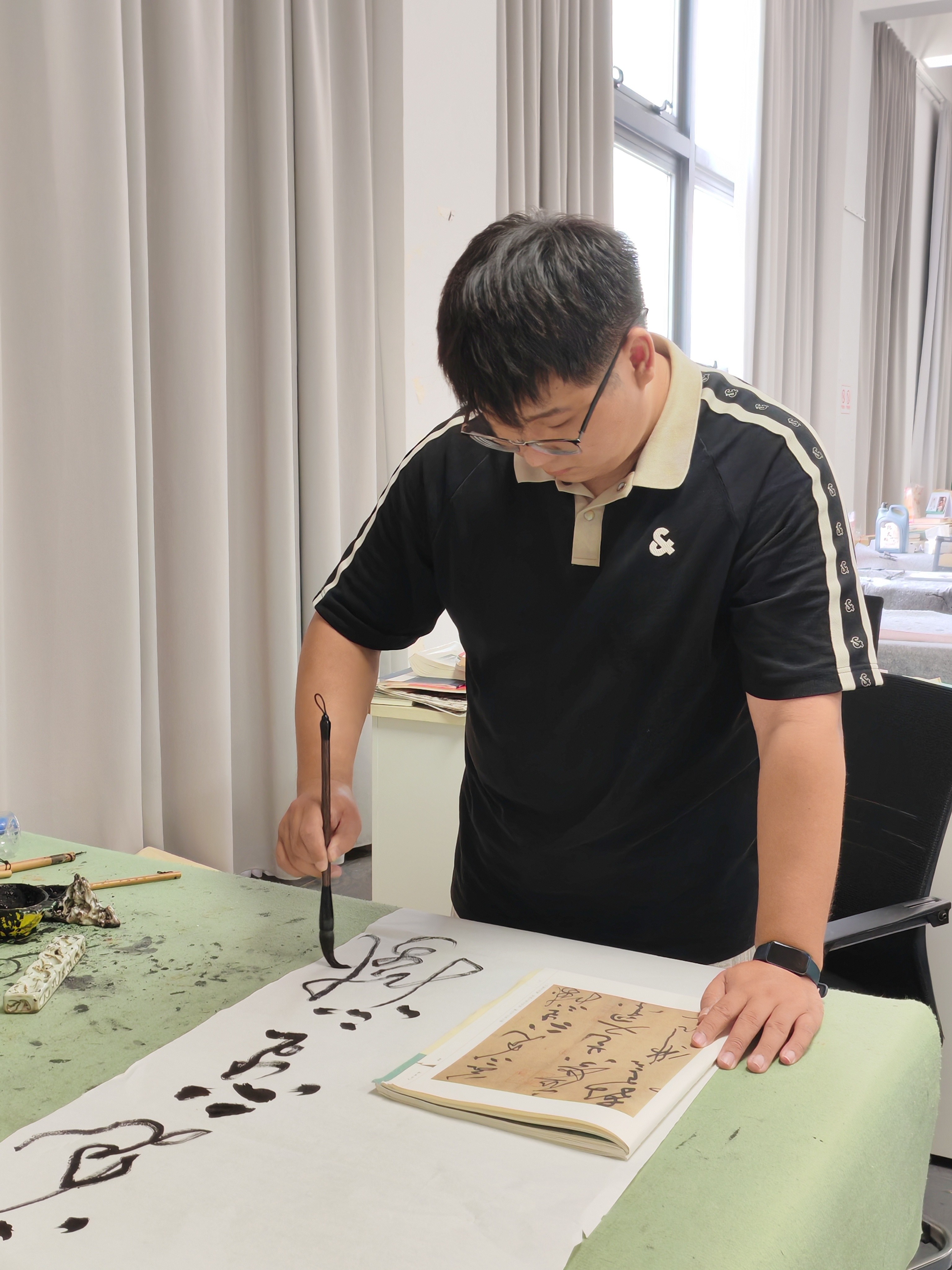 谈及学书感悟,他坦言:“越是深入临帖,越发现自己懂的太少。传统书法里有太多值得琢磨的细节,就像挖宝藏一样,每次都能有新发现。” 这番话没有华丽的辞藻,却凝结了一个大学生在笔墨实践中的真切体会——愿每位热爱书法的同学,都能在练习中保持探索的心态,书写出属于自己的笔墨故事。(林芳羽 姬丁歌 摄)