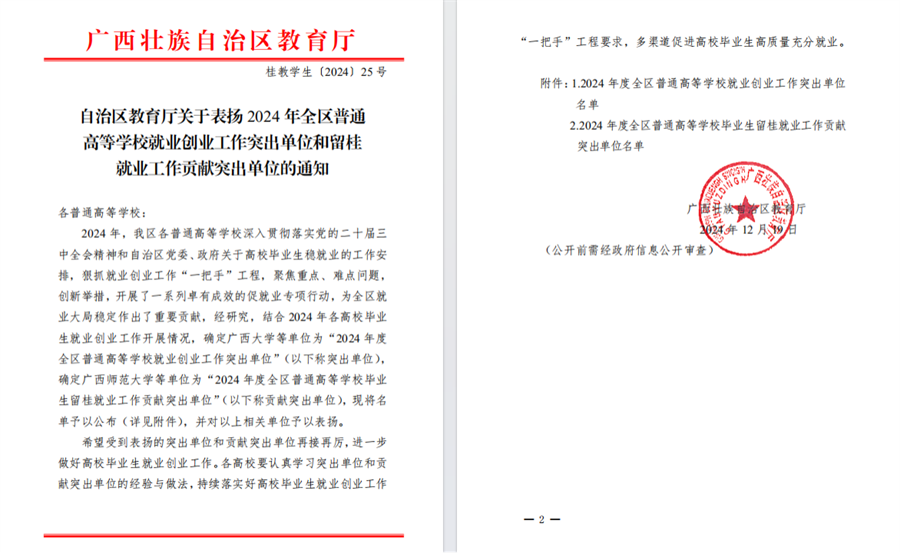 近日,根据自治区教育厅下发《关于表扬2024年全区普通高等学校就业创业工作突出单位和留桂就业工作贡献突出单位的通知》(桂教学生〔2024〕25号)文件,我校荣获“2024年全区普通高等学校就业创业工作突出单位”称号。这是我校第6年获得此项殊荣。