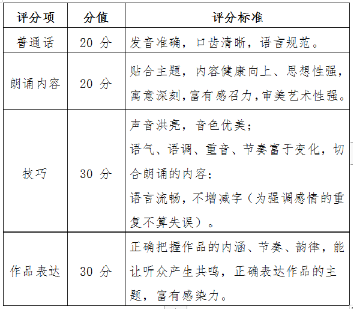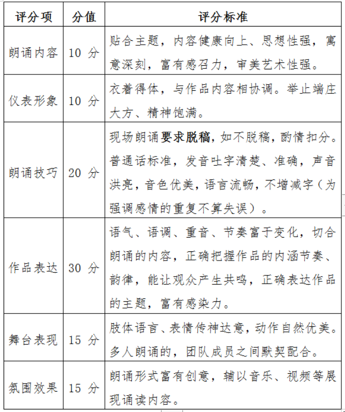 (一)朗诵内容。主题健康向上,内容要兼具思想性、 文化性、艺术性。可自行选取国内公开出版的古今中外优秀经典诗词、散文、文学作品章节等进行朗诵,文体不限。