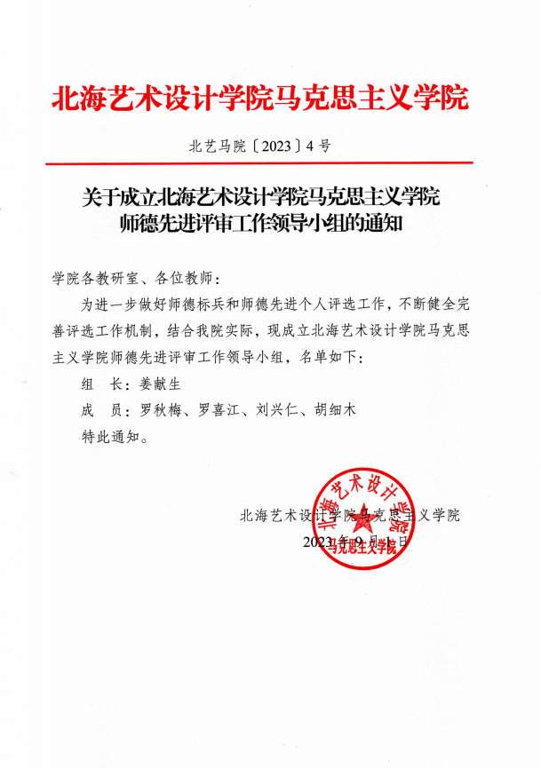 北艺马院〔2023〕4号关于成立北海艺术设计学院马克思主义学院师德先进评审工作领导小组的通知