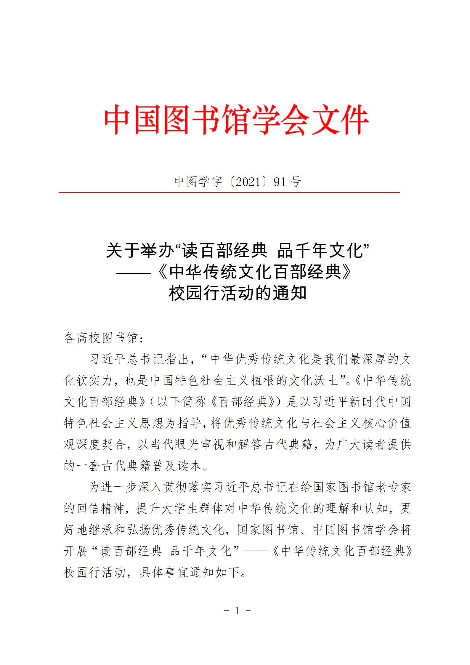 关于举办“读百部经典 品千年文化”——《中华传统文化百部经典》校园行活动的通知