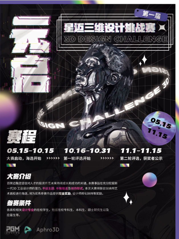 百琪迈集团坚信对人才的投资将是未来持续成长和成功的关键。本赛事旨在切实地为新兴艺术家群体和设计专业应届生群体提供更加优质的成长、孵化环境,充分挖掘新一代3D创作设计师的潜力。本次大赛采用自由式设计规则,不设主题、不限技法及创作形式,设计师可以自由释放创造力,创造非凡的差异化设计。