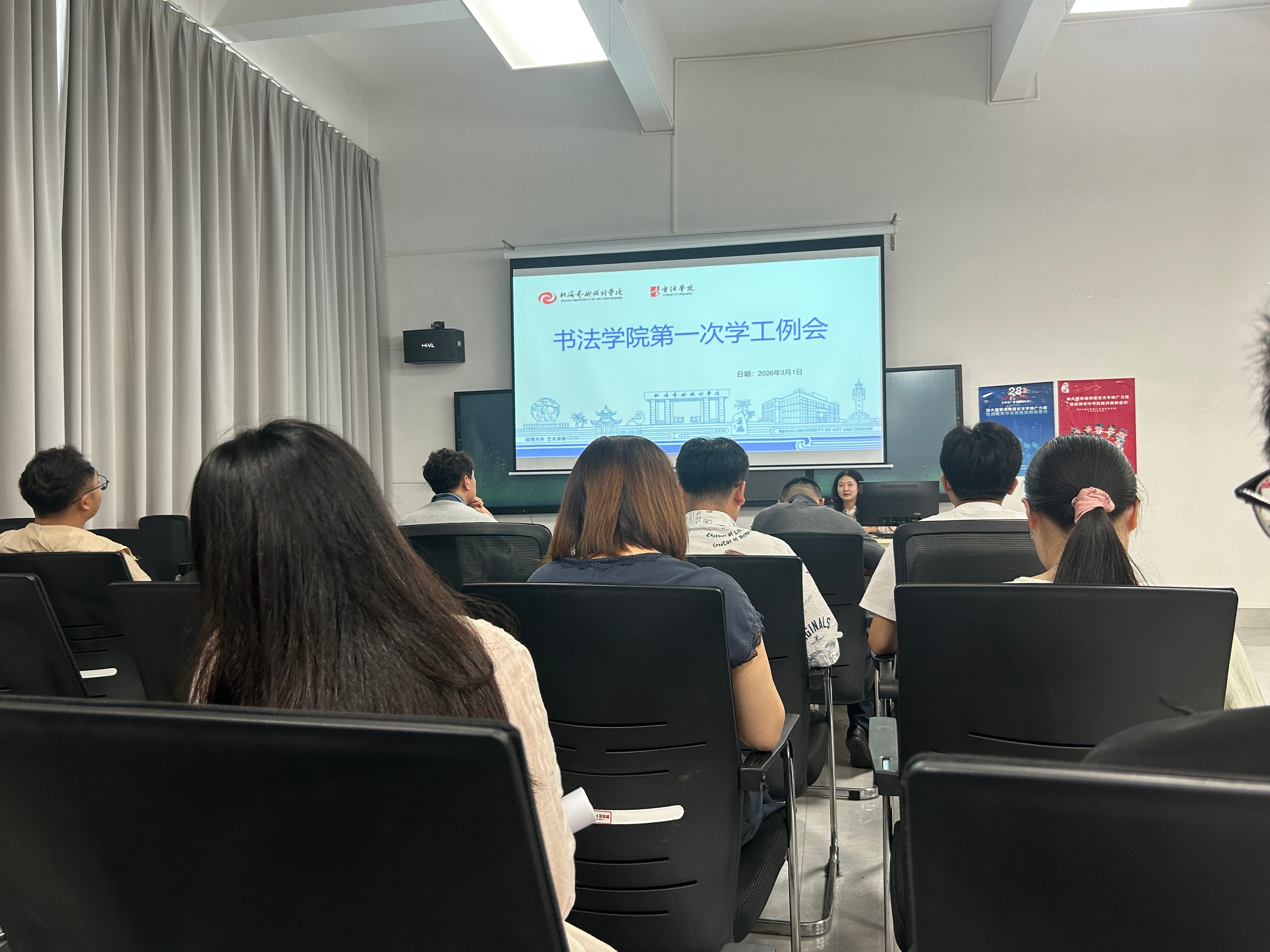 为扎实推进春季学期学生工作,全面落实开学各项部署要求,3月1日下午,书法学院在艺德楼507书法教研室召开三月学生工作例会。学院党支部书记喻广林、副书记左云飞,副院长李家琪、黄荣婷、韦志忍,全体学工教师及辅导员参加会议。会议由学工办主任胡慧捷主持。