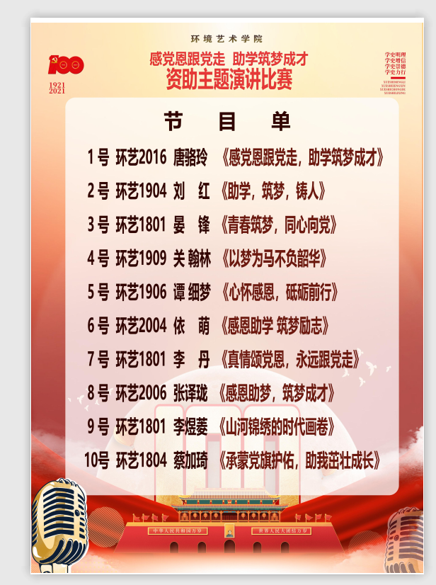 本次比赛的宗旨在于培育受助学生们爱党、爱国情感与感恩意识,并进一步推进学校资助政策宣传工作,在广大学生中掀起学习宣传贯彻“党的十八大”的精神热潮,更进一步地坚定跟党走中国特色社会主义道路的理想信念,同时也加大了同学们对党光辉历史和光荣传统的了解。于建党百年之际,参赛选手们共述自己同国家政策资助下的成长事迹、实际行动与心路历程,心怀感恩党和国家的资助之心,根种爱国情愫,坚定“感党恩跟党走”信念,不忘初心、牢记使命、砥砺前行。
