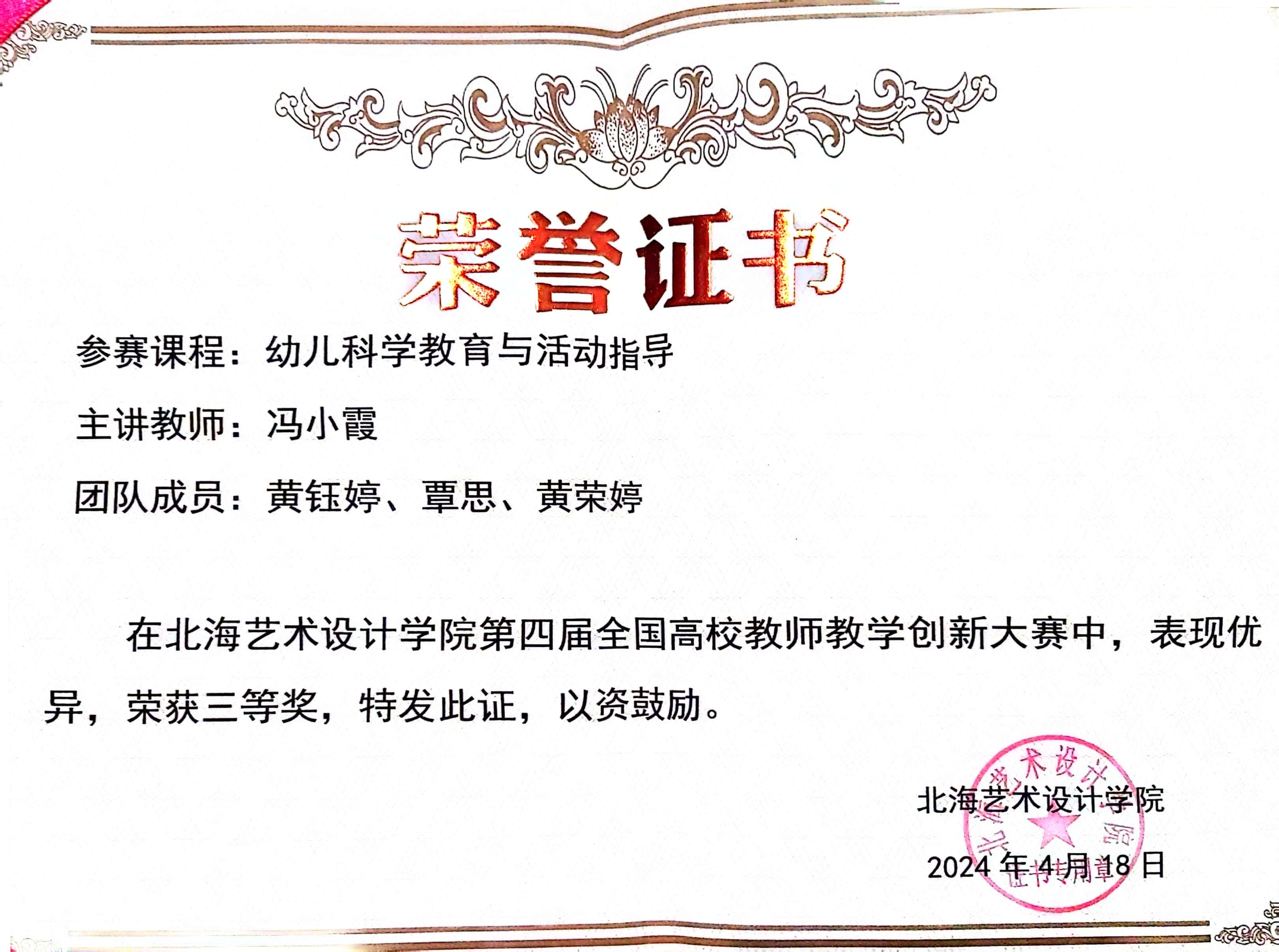 在学院“问题导向、创新驱动”的课程改革方针指导下,学前教育专业教师团队深耕课堂教学,聚焦真实问题提出解决方案,形成了一批具有辐射推广价值的创新成果。黄荣婷老师主讲的《学前儿童语言教育》课程,凭借“理论-实践-师德”三位一体的创新设计,连续斩获第三届、第五届校级教学创新大赛一等奖;冯小霞老师以“四新”理念重构《幼儿科学教育与活动指导》课程,获第四届校级教学创新大赛三等奖;覃思老师主讲的《幼儿园课程》则通过“课程思政+专创融合”模式获第五届校级教学创新大赛优秀奖。连续三届的优异成绩,不仅彰显了教师们扎实的教学功底与创新能力,更印证了学院“以赛促教、以赛促改”机制的显著成效。
