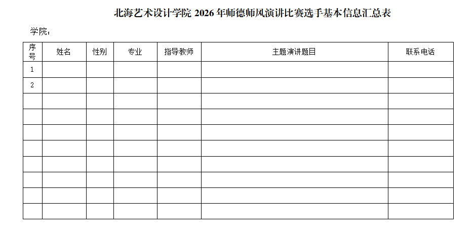 参赛选手于2026年4月21日15:00前将参赛选手信息汇总表电子版发送至教育学院团总支邮箱(978430004@qq.com)。