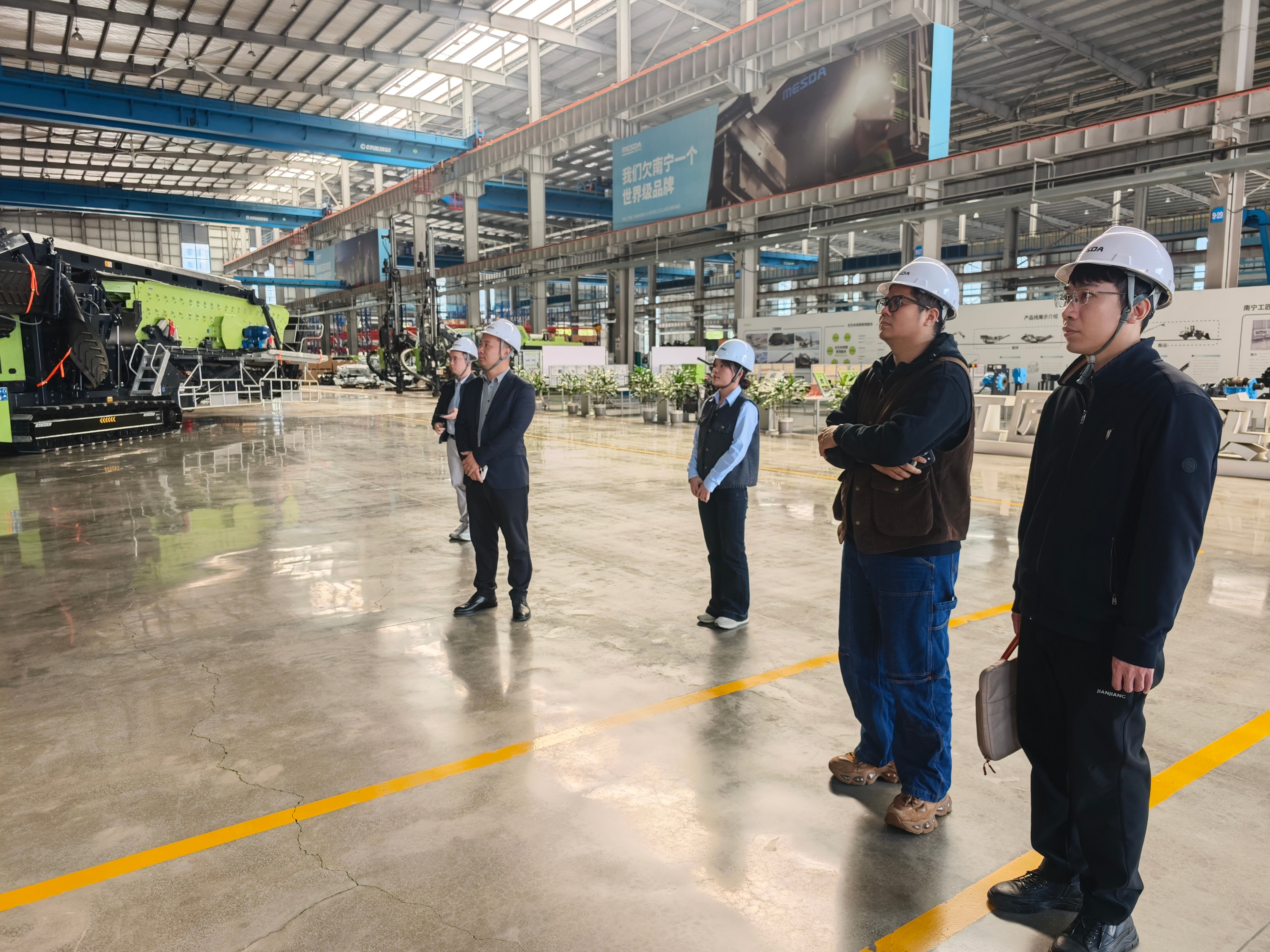 随后,专项调研组到访广西美斯达工程机械设备有限公司,先后参观了企业生产车间、机械设备展厅,企业负责人潘妹珍女士详细介绍了公司在工程机械研发、设计、生产领域的核心优势,以及在产品工业设计、外观创新、品牌视觉体系搭建等方面的实际需求。座谈会上,校企双方聚焦工业设计与工程机械制造的融合发展展开深度研讨,企业方针对工业设计专业人才培养提出具体建议,希望强化学生的工程思维与产品落地设计能力;学院则详细了解了企业在工业设计、产品设计等岗位的人才招聘标准与培养期望,为后续优化人才培养方案积累了一手实践资料。