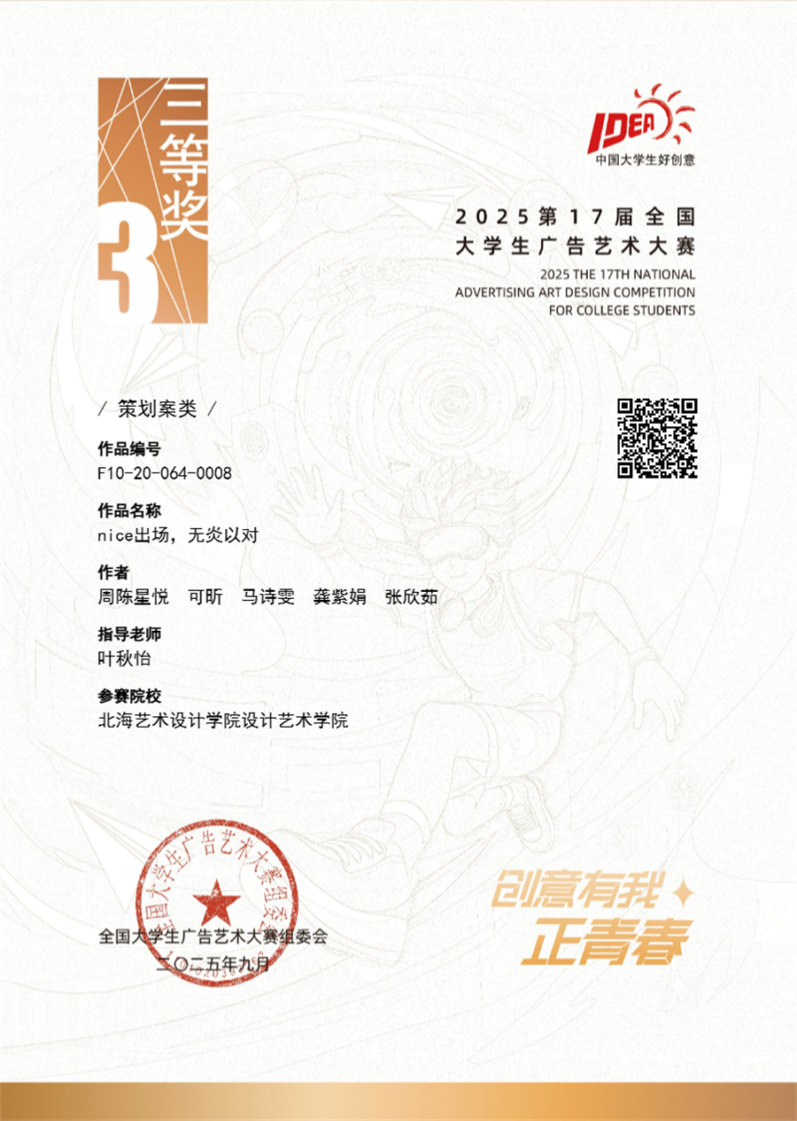 据悉,全国大学生广告艺术大赛是全国规模大、覆盖高等院校广、参与师生人数多、作品水准高的全国性高校文科竞赛,是由教育部高等教育司支持,教育部高等学校新闻传播学类专业教学指导委员会、中国高等教育学会广告教育专业委员会共同主办的全国高校设计大赛国家级A类赛事。