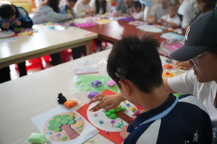 发挥艺术专长,绘就七彩童年。绘画手工创作中,志愿者与孩子们采取“一对一”结对帮扶模式,围绕“我心目中的春天”主题开展美术创作。志愿者充分发挥专业所长,耐心指导孩子们运用彩笔、卡纸、超轻粘土等创作材料,将心中对春天的憧憬、对美好生活的向往转化为一幅幅色彩斑斓的画作和一个个创意十足的手工作品。创作过程中,志愿者与孩子们亲切交谈、耐心鼓励,用真诚的赞美呵护孩子们的创作热情与自信心,现场洋溢着温馨和谐、互帮互助的浓厚氛围。