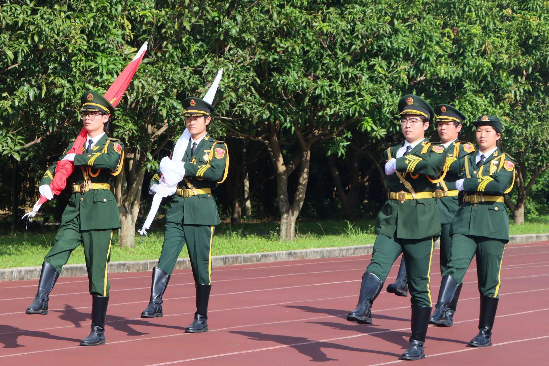 清晨 ,金色阳光洒满操场,国旗护卫队队员身着整齐制服,肩扛国旗迈着铿锵有力的正步从操场东侧走向升旗台。每一步步伐统一、落地有声,清脆的脚步声在安静的校园里格外响亮,吸引着在场师生目光紧随其后。到达升旗处后,护旗手动作娴熟地展开国旗,随着庄严肃穆的《义勇军进行曲》前奏响起,全场瞬间肃静。国歌奏响时,五星红旗在晨光中缓缓上升,师生们昂首挺胸、肃立注目,目光紧紧追随国旗,用庄重姿态传递对祖国的崇敬与祝福。