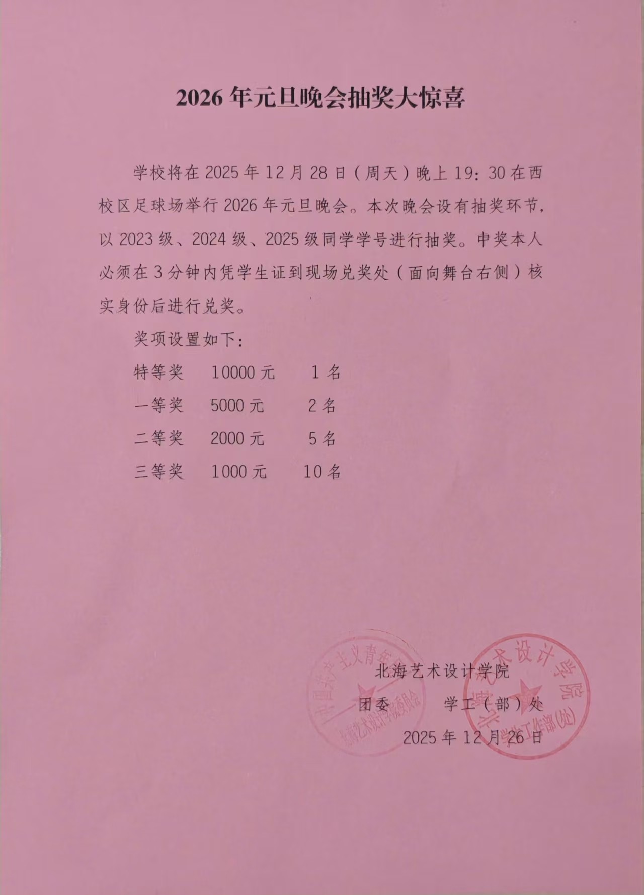 12月20日,2026年元旦晚会抽奖活动封箱仪式在行政楼118顺利开展,参加本次封箱仪式的老师有:学生工作部(处)部长班媚,纪检办公室主任、传媒艺术学院党总支书记王明森。